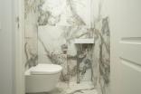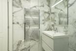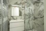 The luxury bathrooms have a luxury walk-in shower, floating toilet, washbasin with a built-in cupboard, built-in spotlights, and a designer towel radiator. The wall and floor coverings provide an extra luxurious touch.