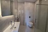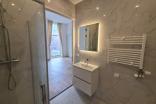The modern bathroom is equipped with a shower, vanity unit, wall-mounted toilet, radiator, ventilation, and a washing machine connection.