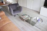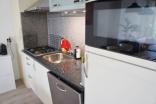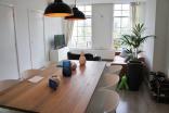 The apartment has a shared entrance on the ground floor with stairs leading to the second floor. The bright and generous living room is located at the front and offers a warm atmosphere thanks to the characteristic stained-glass windows. The open kitchen is fully equipped with built-in appliances, including a combi microwave/oven, fridge-freezer, gas stove, and extractor hood.