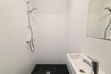 Spacious bedroom with extra space for possible wardrobes, modern bathroom with shower cabin and fixed washbasin, and a separate toilet.