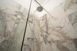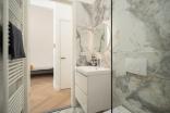 Slaapkamer en badkamer toegang via de hal. Badkamer is voorzien van natuurstenen tegels, regendouche, verwarmde spiegel met verlichting, handdoek radiator, badmeubel met lades en zwevend toilet.