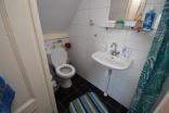 Trap naar de slaap etage met schuine wanden. De badkamer is voorzien van een douche, wastafel en toilet.